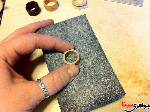 اگر میخواهید انگشتر را با سنگ تزیین کنید، باید دو نوار روکش نازک را طوری ببرید که هر دو روی نوار روکش اصلی قرار بگیرند و بین آنها بقدری فاصله باشد که بتوانید تکههای سنگ را قرار بدهید . روش ساده تر این است که یک نوار کلفت ببرید و آن را از یک سوم ابتدایی به دو قسمت تقسیم کنید (به تصاویر دقت کنید) . یک سر نوار را سنباده نزنید و سری که دوتا شده را با سنباده نازک تر کنید . به این ترتیب میتوانید روکش پایه و روکشهای رویی را از یک نوار استفاده کنید .