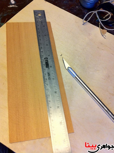 ابتدا باید با کمک یک خط کش روکشهای چوب را به نوارهای باریک تقسیم کنید . اگر کاتر یا تیغ تان به اندازه کافی تیز نباشد، نمیتوانید روکشها پاره میشوند . بعد از بریدن نوارها، باید دو سر نوار را سنباده بزنید . سر نوارها باید کاملا نازک بشود؛ در غیر اینصورت وقتی آنها را بپیچید خیلی پیچ میخورند و سفت نمیشود . در ضمن با اینکار پنهان کردن درزهای روی انگشتر هم ساده تر میشود .