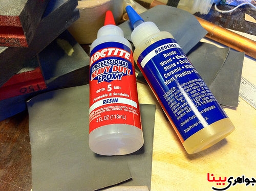 حالا یک تکه کاغذ دیگر بردارید و روی آن چسب اپوکسی را با خلال دندان مخلوط کنید. چسب اپوکسی معمولا دو قسمتی یا دوقلو عرضه میشود که خودتان باید آن را مخلوط کنید . وقتی چسبها را خوب با هم مخلوط کردید، کمیپودر سنگ روی آن بریزید و دوبار با هم مخلوط کنید .
