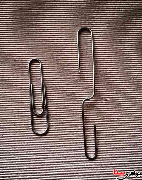 یک گیره کاغذ را به شکل زیر از هم باز کنید با قلاب کردن یک طرف زنجیر به گیره کاغذ و گرفتن آن با انگشتان به راحتی می توانید طرف دیگر دستبند را به قفل آن وصل کنید .
